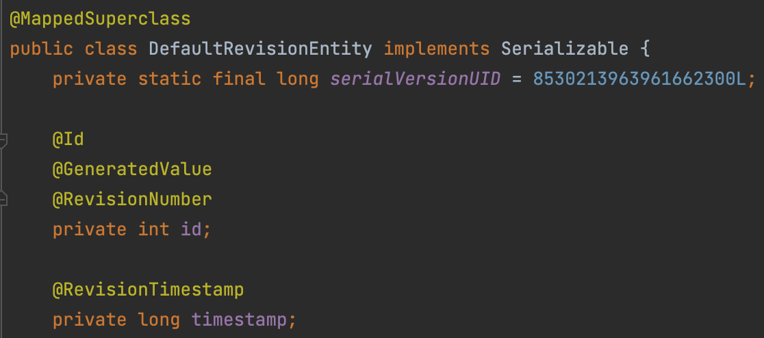별도의 RevisionEntity를 정의하지 않고 사용하면 위의 DefaultRevisionEntity를 사용하게 되는데, id와 timestamp의 정보만을 기록하고 id의 경우에는 int의 범위만을 제공한다. 작성자에 대한 정보를 담고, id의 범위를 Long으로 수정을 진행하면 다음과 같이 진행할 수 있다.