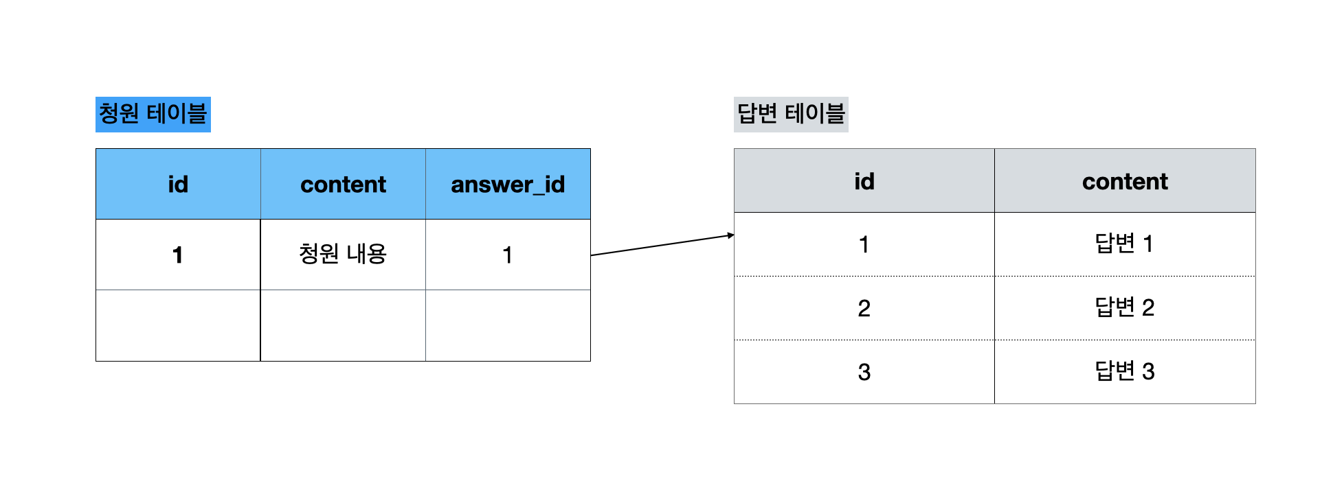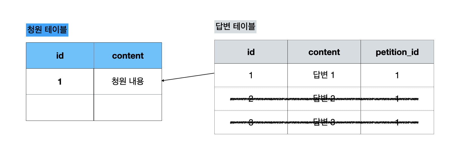 하지만, 지금의 방식에서는 unique 조건은 아무런 의미가 없는 제약 조건이 된다. 연관관계의 주인이 청원 테이블인데, 청원의 답변은 매번 등록될 때마다 새로운 id를 발급받게 되게 된다. 즉, 답변이 3개 달리더라도 unique 제약조건과 관계없이 모두 정상 생성된다.