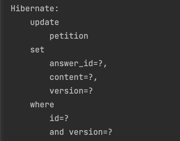 위의 설정만을 진행하더라도 아래와 같이 version을 함께 db에 전달해주며 해당 version과 맞지 않을 시 ObjectOptimisticLockingFailureException이 발생하게 된다. 즉, 맨 처음 답변 이외에는 모두 실패하게 되고 위의 테스트를 통과하게 된다. 간단한 설정 하나로, 동시성 이슈에서 하나의 답변만을 허용하도록 설정을 진행할 수 있었다.
