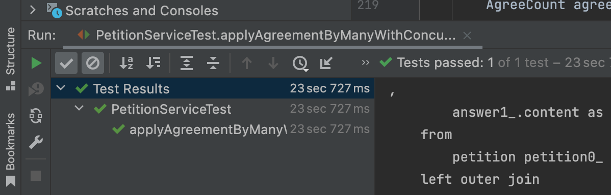 AgreeCount의 테이블을 분리하게 되면, 서비스의 코드는 아래와 같이 구현할 수 있다. Peition의 row가 아닌 AgreeCount를 증가하는 작업을 할 때에만 비관적 잠금을 걸게 되었기 때문에 성능적으로도 이득을 볼 수 있을 것이라 예상했다.